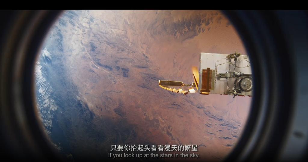 《窗外是蓝星》是中国首次将航天员在太空的工作生活,忠实记录于电影。当看到神舟十三号发射时,色彩斑斓的火焰在银幕上炸开,红蓝紫三色交织像一场烟花秀。飞船冲向太空时,脱落的保温外壳像星星滑落,神舟十三号就像一粒火种,在太空中渺小却闪亮。我们感到了无比震撼,为祖国的强大而感到自豪。影片中还有一段从太空视角展示地球风物的画面——华北平原,青藏高原,喜马拉雅山脉,塔克拉玛干沙漠,云贵高原,山东半岛,南海……静谧的太空与人类的渺小,用直白却恢弘的镜头语言呈现于我们眼前。
