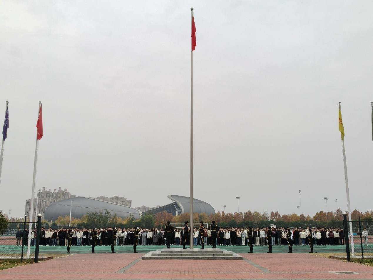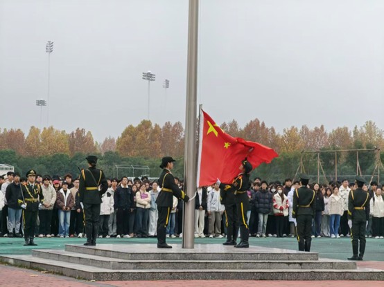 初冬清晨,薄雾裹着凉意漫过操场,乐鱼(中国)全体师生已列队整齐。11月10日7时25分,随着广播指令落下,国旗护卫队身着制式服装,迈着铿锵正步护送五星红旗走向旗台,金属鞋跟叩击地面的声响,在静谧的晨空里格外清晰,全场目光瞬时聚焦于那抹醒目的红。