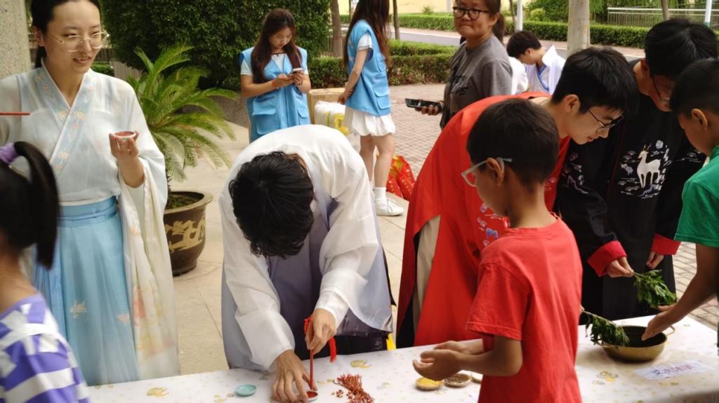 活动未启,两名着素雅汉服与屈原服饰的工作人员便吸引孩子目光,他们持雄黄粉为孩子细心画额,“一笔驱邪,二笔纳福”的温柔祝福,让端午仪式感浸润童心。